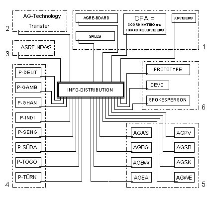 Within the ASRE there are areas of responsibility. When an enquiry regarding a project is sent to us from interested people, this enquiry is passed on to our technology analysis section (2). The enquiry is analysed to see if improvement of the economical and social situation of the target group can be expected. A meeting with the co-ordinators of the sections 4 and 5 takes place, afterwards resulting in an ASRE project plan. Afterwards, the co-ordinating and financing advisers (CFA) analyse what possibilities are available to finance the project and partners are contacted. Then starts the process of engineering design in section 5, where the engineers and trainers do their work. Also, do-cumentation for prototype construction and educational planning are processed here in section 5 (see below).